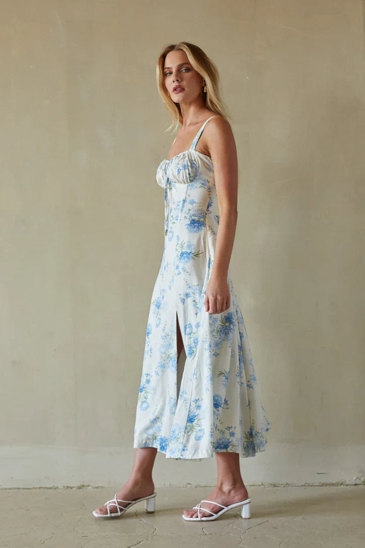 another style within 30 days of receiving your order.This Angelina Sweetheart Tie Front Floral Midi Dress features a strapless design with a sweetheart neckline and adjustable straps, creating a flattering fit for everyone. The delicate blue and white floral print adds a touch of femininity, while the lace up back detail adds a unique touch. Perfect for any occasion, this midi dress is a must-have for any wardrobe.