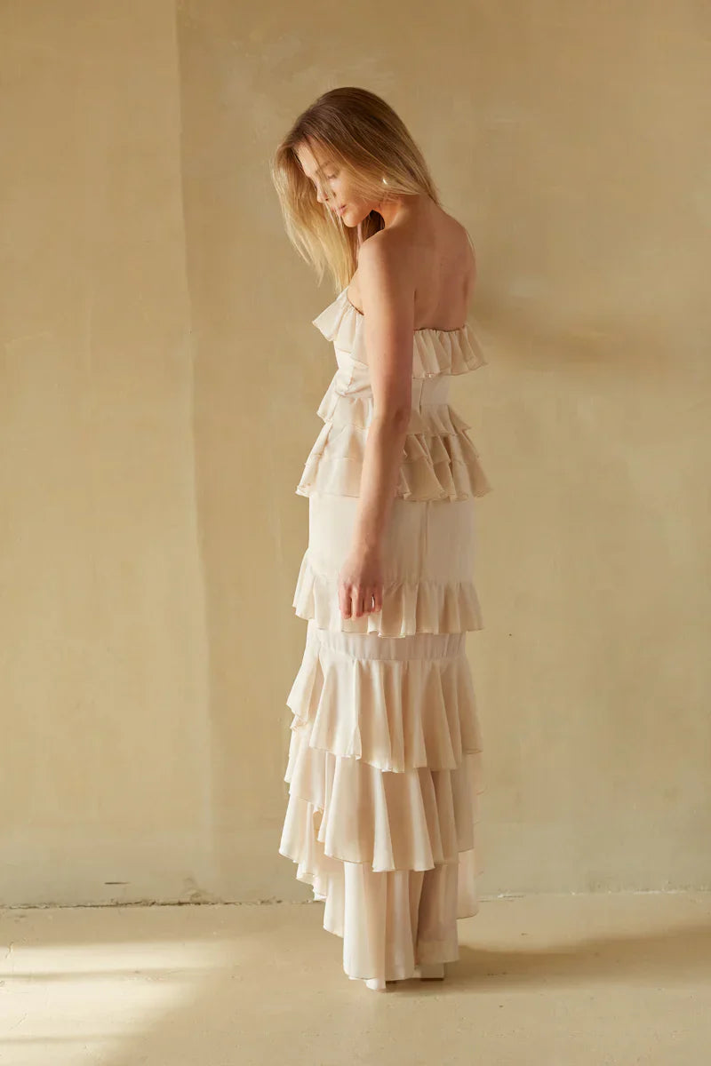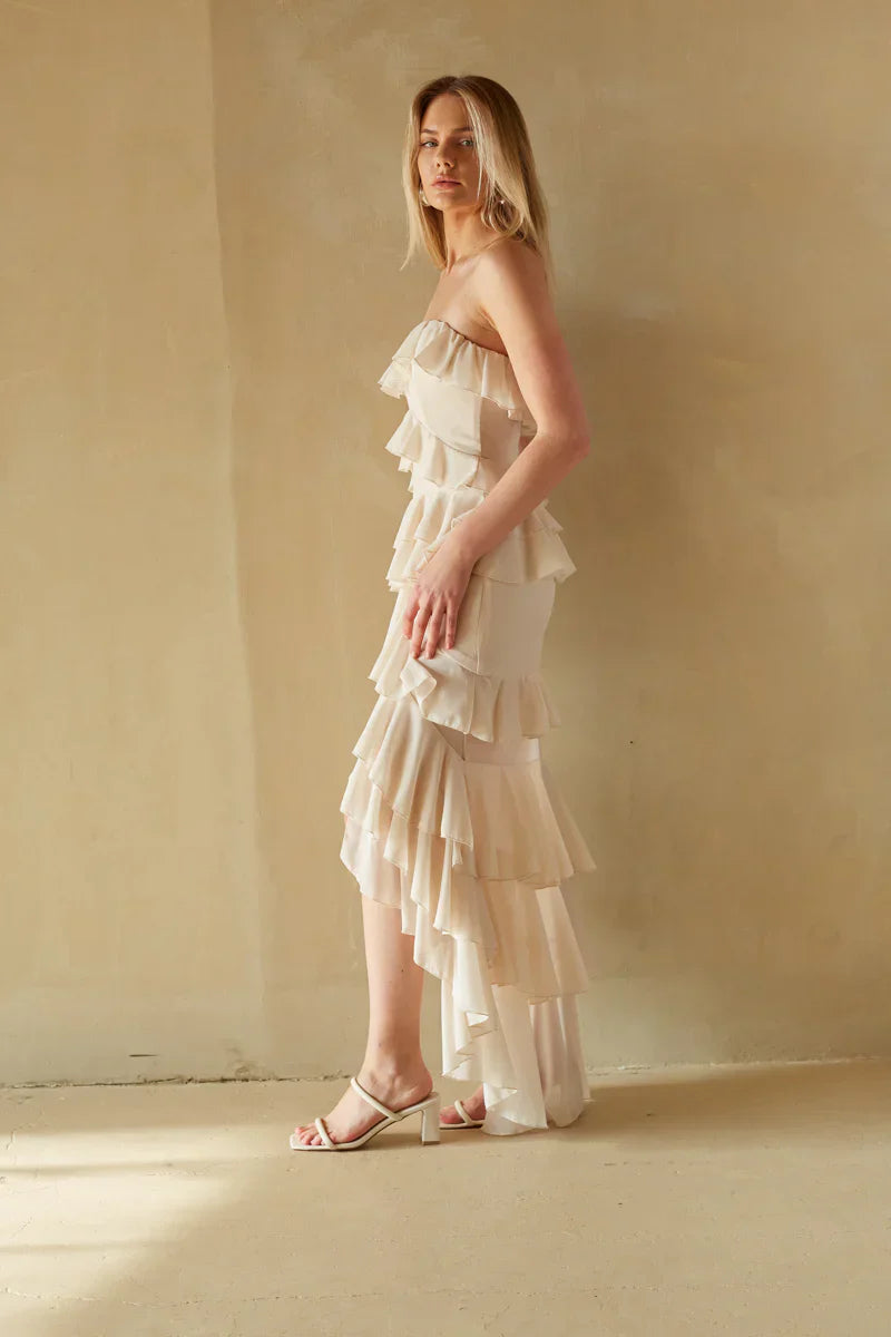 another style within 30 days of receiving your order.They'll be falling in love when they see you in the Clementine Strapless High Low Ruffle Maxi Dress! This elegant dress features a strapless sweetheart neckline, boning in the bust for structure, a ruffle trim, tiered ruffles throughout, and a high-low hem. Finish off the look with some simple !