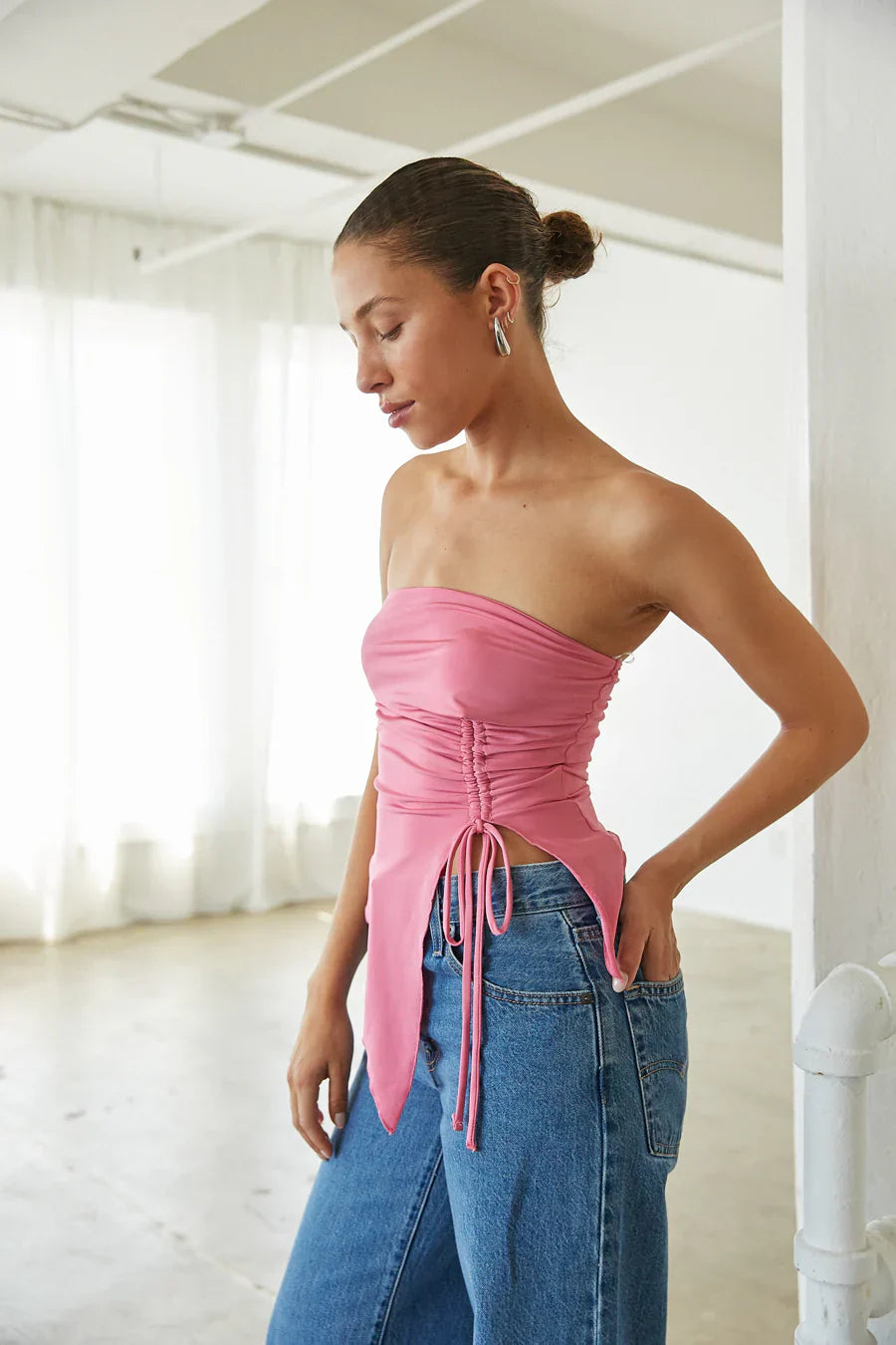another style within 30 days of receiving your order.If you love the , you'll love her younger sister, the Gia Asymmetrical Cinch Tube Top! This asymmetrical features a pointed hem, adjustable side cinch drawstring, and pop of color! Available in Candy Pink and Chambray Blue; pair this going out top with you favorite for a quick, cute outfit!
