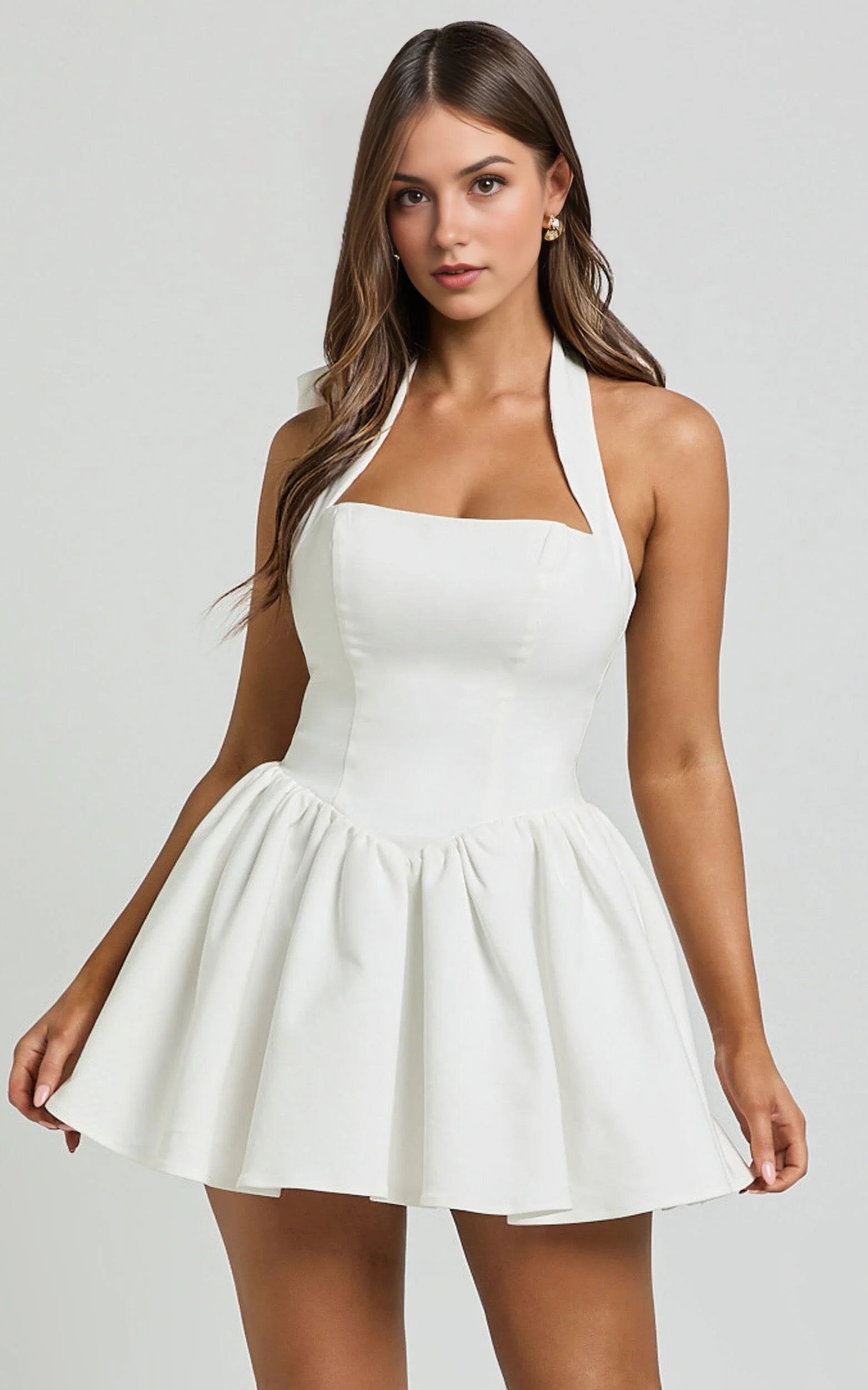 another style within 30 days of receiving your order.Make an unforgettable entrance in the Helda Mini Dress — a sleek and structured showstopper made for those who lead with confidence. Featuring a halter tie neckline and sculpting corset-inspired paneling, this white mini is a modern ode to femininity and strength.
