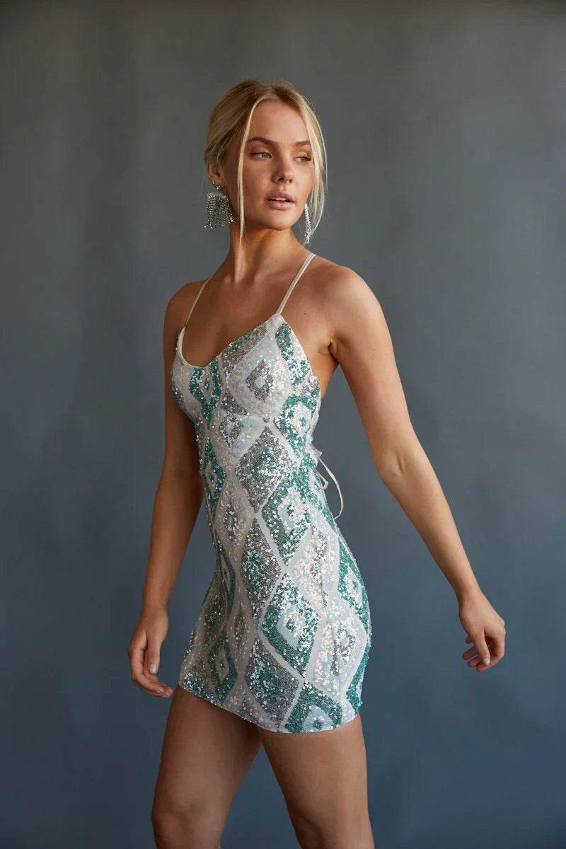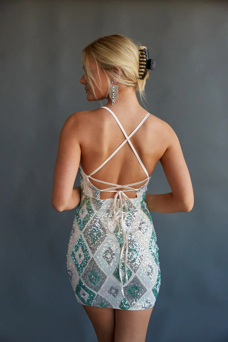 another style within 30 days of receiving your order.Shine bright in the Lauren Diamond Sequin Bodycon Mini Dress! This fun dress is complete with a V-neckline, bodycon silhouette, satin spaghetti straps that lace up in the back, and sparkling sequins that create a diamond pattern. Finish off the look with your favorite !