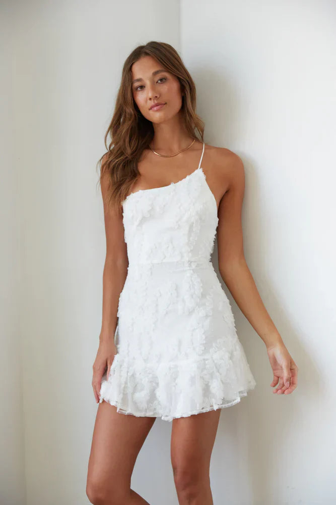 another style within 30 days of receiving your order.Hey babe, meet the mini dress of your dreams! The Livia One Shoulder Lace Ruffle Mini Dress is the perfect white party dress. Featuring an asymmetrical neckline with an adjustable spaghetti strap, ruffle hem, and subtle polka dots. Available in white and blue. Complete the fab look with the .