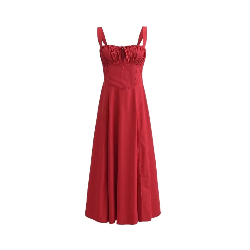 The silhouette of this dress is simply divine, featuring a flattering corseted back that cinches the waist for a perfectly tailored fit. The gathered bust, adorned with a delicate drawstring tie, adds a touch of whimsical charm, while the seductive side split reveals just the right amount of leg, adding a hint of allure to your ensemble.