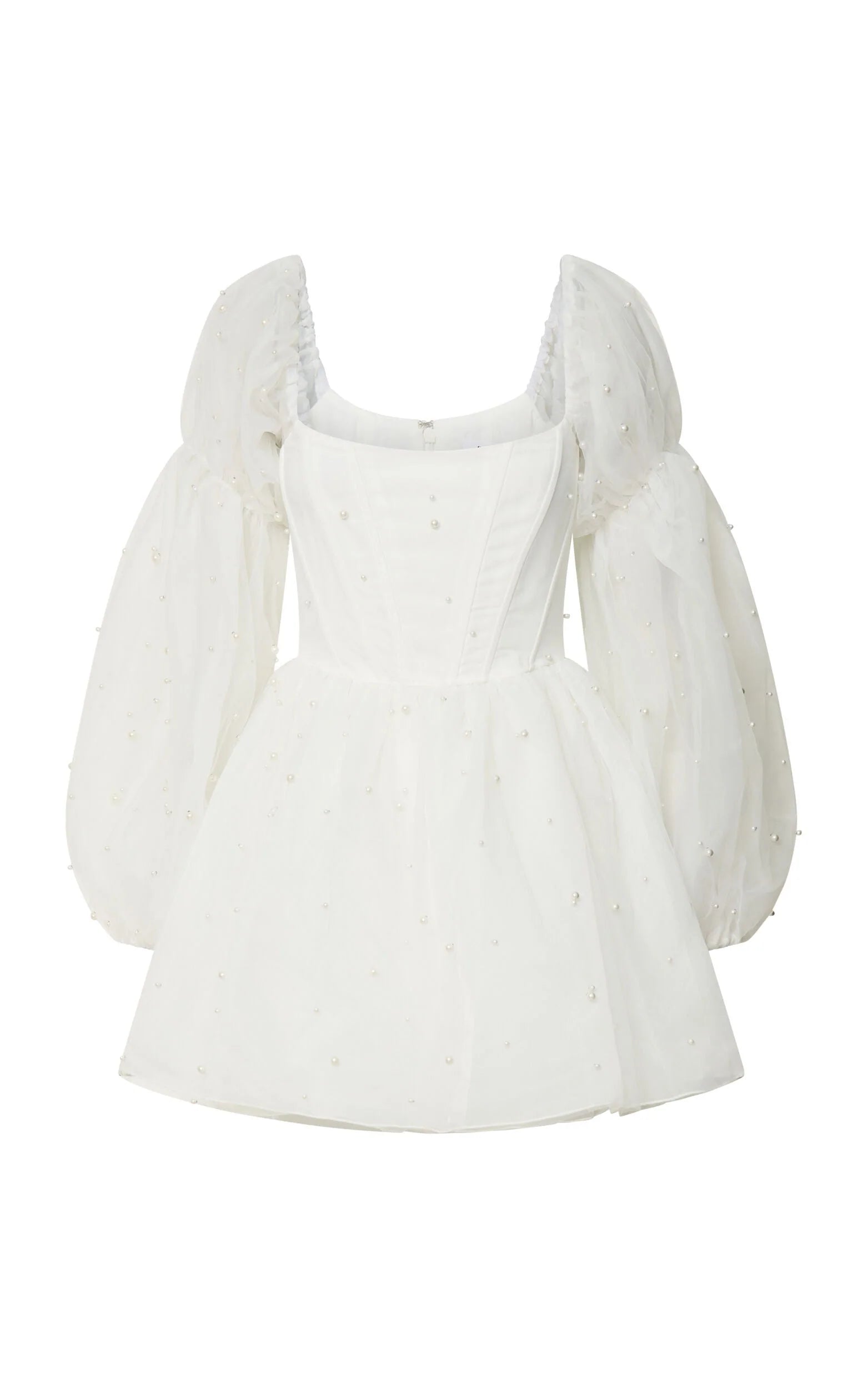 another style within 30 days of receiving your order.Step into modern elegance with this white mini dress, featuring long puff sleeves and delicate pearl-inspired accents for a look that's both sophisticated and bold. Designed with a flattering square neckline and crafted from soft mesh over a smooth lining, this piece is ideal for special occasions where making an impression matters.