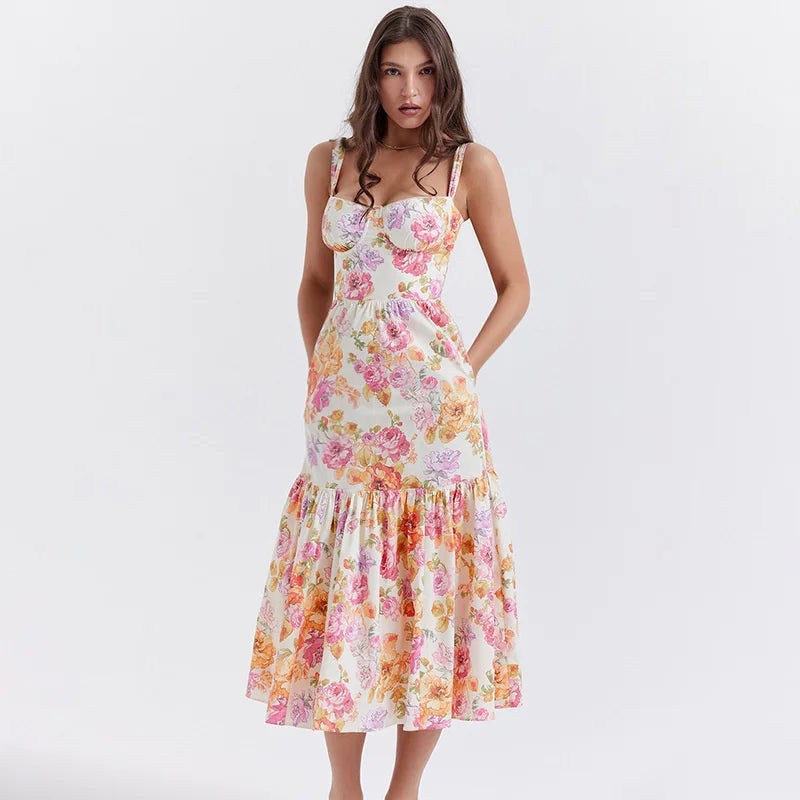 The dress boasts a charming sweetheart neckline and subtle ruffle accents, adding an extra layer of femininity and allure. Perfect for garden parties, weddings, or an afternoon brunch, this floral midi dress effortlessly transitions from casual to chic with the right accessories.