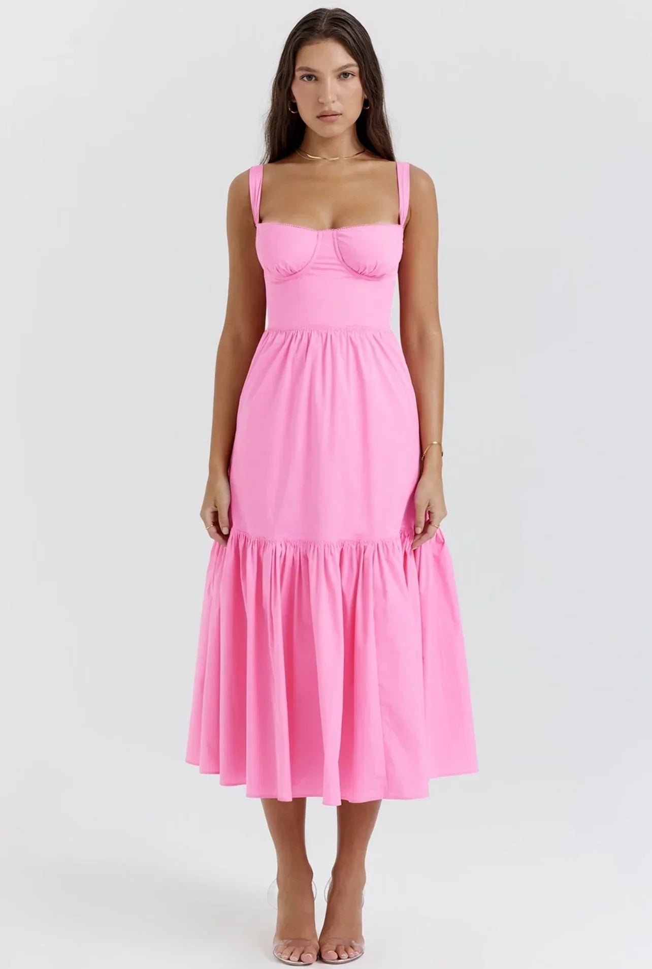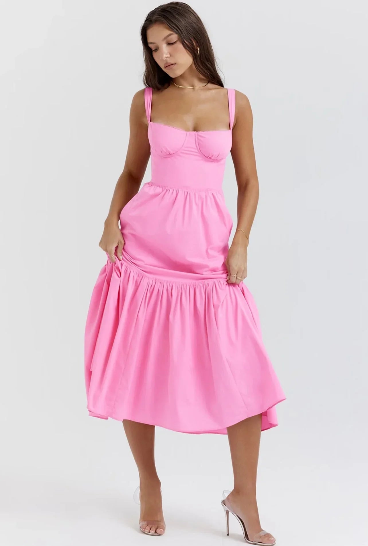 The flattering midi length offers a sophisticated silhouette that gracefully skims the body, while the lightweight fabric ensures comfort and ease of movement. A cinched waist enhances your natural curves, and the soft, flowing skirt adds a touch of whimsy and grace.