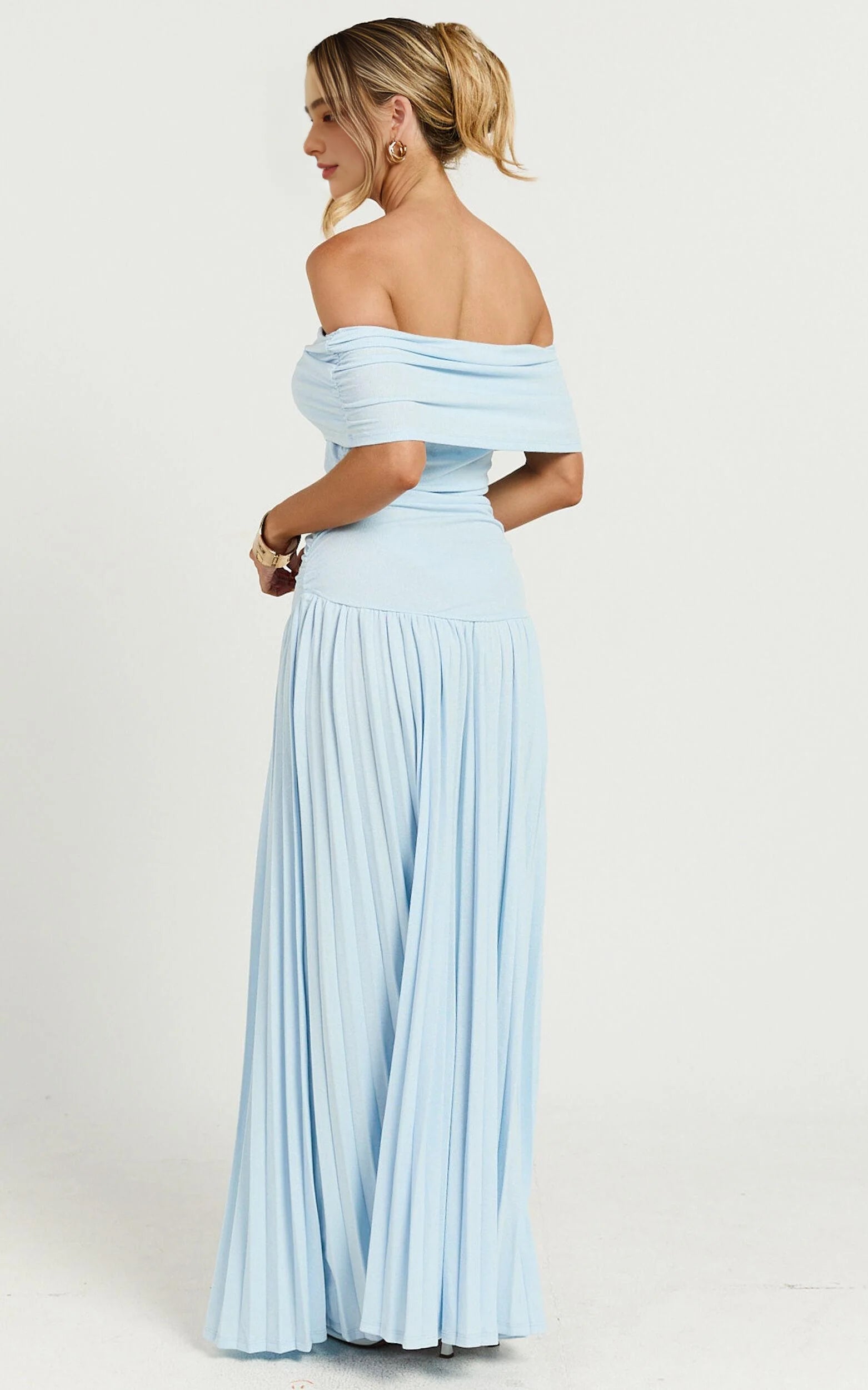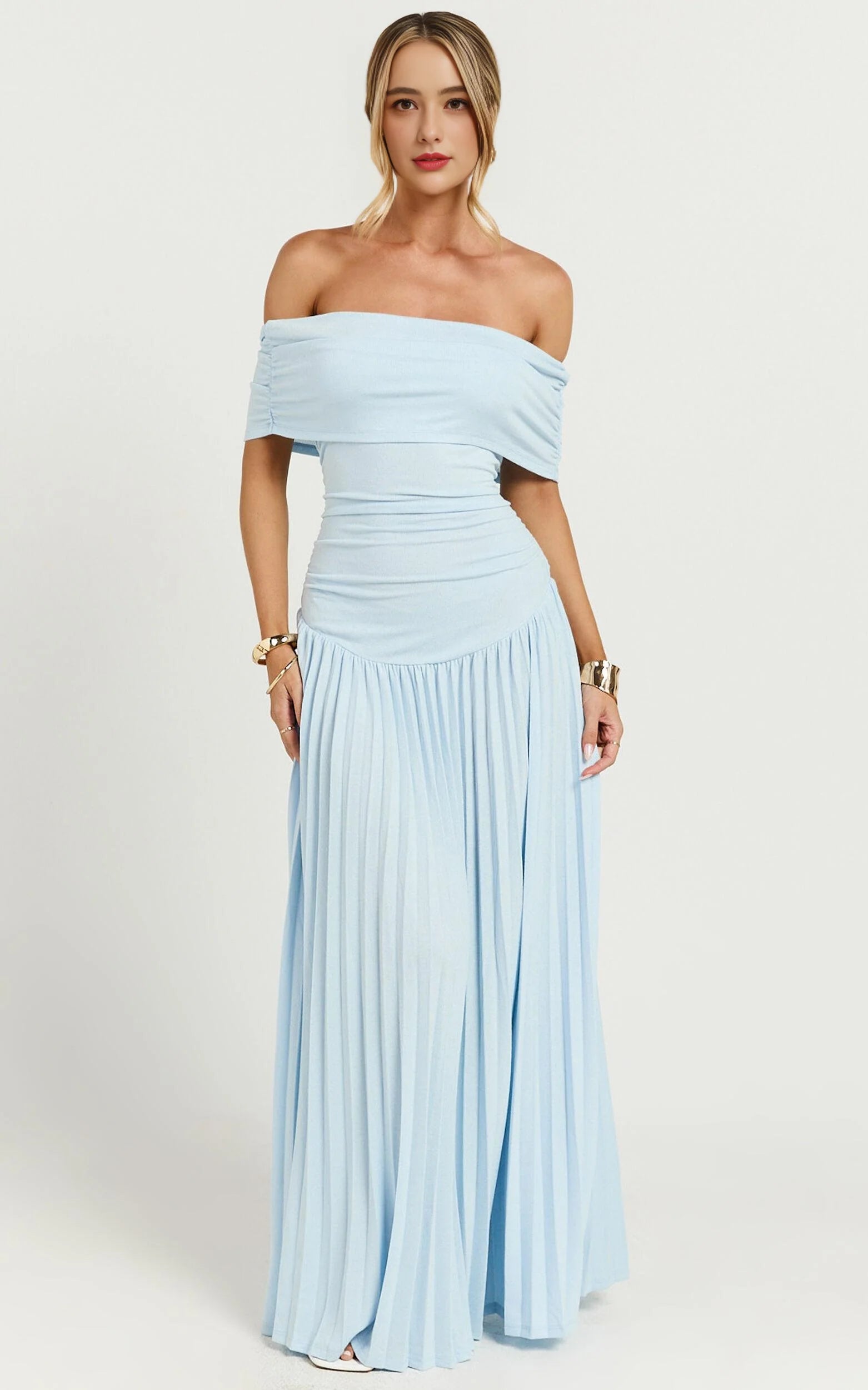 another style within 30 days of receiving your order.Embrace effortless elegance in this soft blue maxi dress, featuring a breezy off-the-shoulder design and playful short sleeves. Crafted from a lightweight woven fabric, its relaxed shift silhouette offers both comfort and style, making it the perfect choice for parties or sun-soaked celebrations.