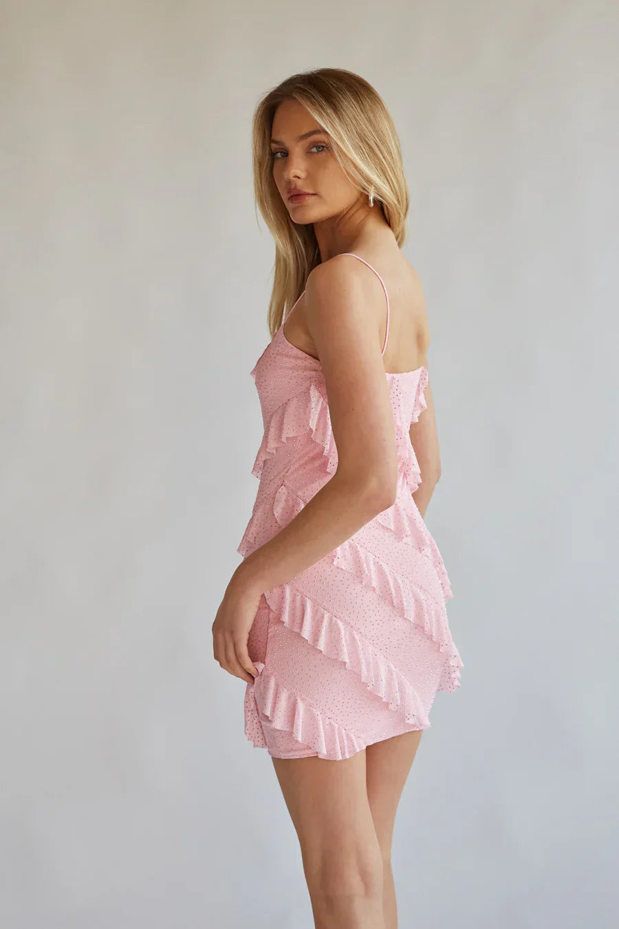 another style within 30 days of receiving your order.Be the life of the party in the Riri Rhinestone Ruffle Mini Dress! This sparkly party dress features a soft V-neckline, all-over rhinestone embellishments, thin spaghetti straps, asymmetrical tiered ruffles, and a bodycon silhouette. Slip into a fun to complete the look!