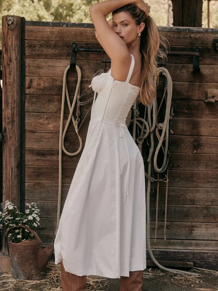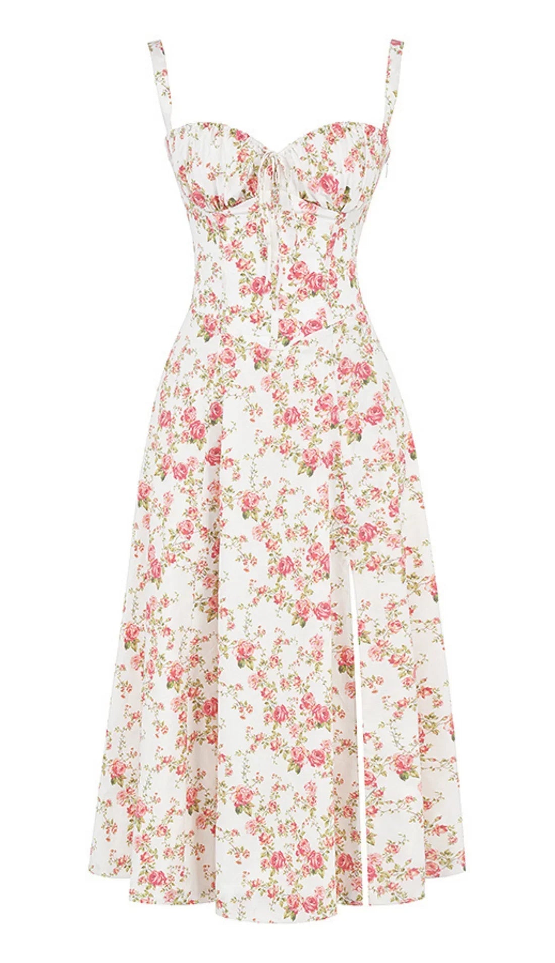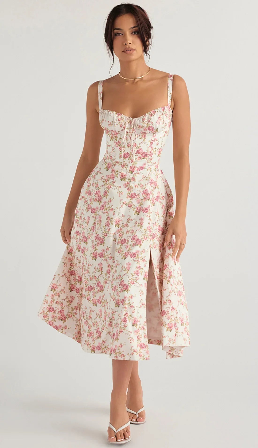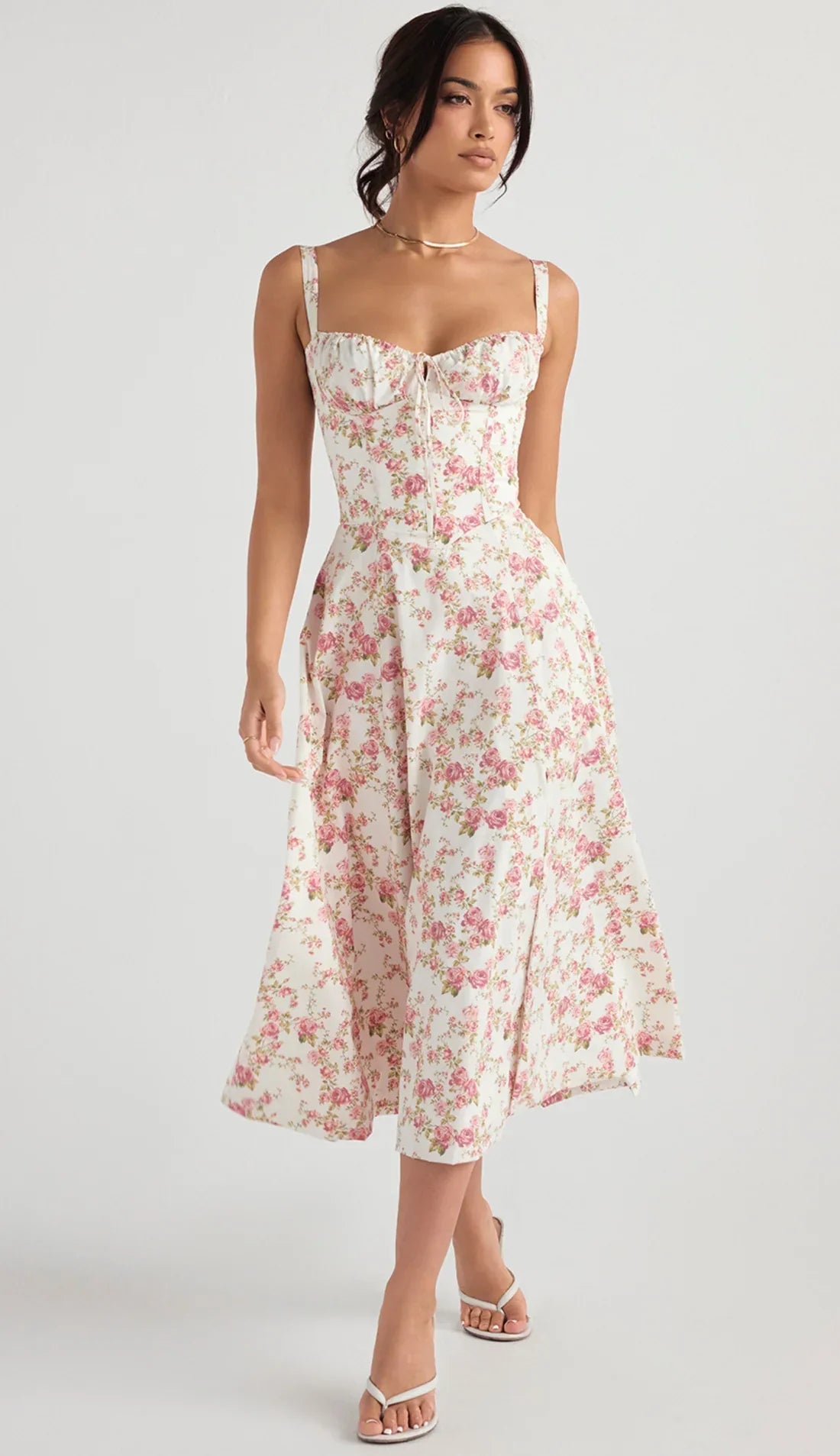 another style within 30 days of receiving your order.Indulge in the romance of Selena Corset Midi Dress with our exquisite floral corset-style midi dress. Like a canvas painted by Monet himself, this dress blooms with delicate blossoms, capturing the essence of a sun-kissed French garden. The corset bodice embraces you in a delicate embrace, intertwining strength and grace. With every step, the midi length whispers of poetic strolls along the beach, while the floral motifs dance like memories caught in a gentle breeze. Elevate your style to a symphony of elegance and letSelena Corset Midi Dress be the chapter where you become the embodiment of summer dreams.