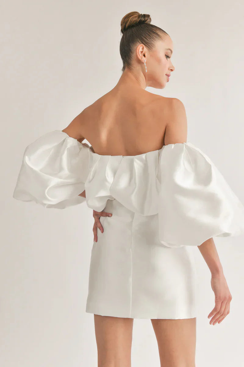 another style within 30 days of receiving your order.You'll look like you just stepped out of Heaven in the Theresa Off-The-Shoulder Puff Sleeve Mini Dress! This stunning dress features an A-line silhouette and a puffed bodice and off-shoulder sleeves. Pair it with a sleek for an unforgettable look!